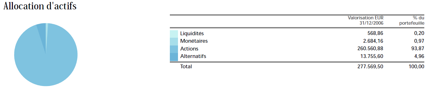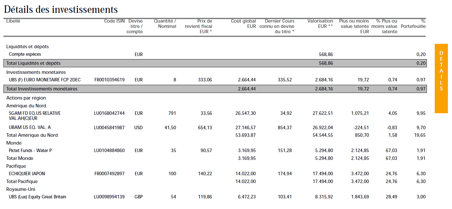 A summary table shows a summary of one or several amounts (measurement) by one or several criteria (dimensions). It can for example show the client’s holdings by asset type as shown here: