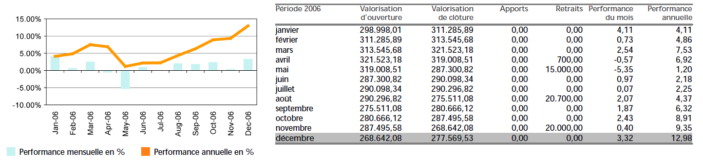 A detailed chart shows one or several series of points, like for example the monthly historical performance of the client’s holdings as shown here: