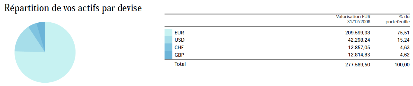A summary chart shows a summary of one or several amounts (measurement) by one or several criteria (dimensions). It can for example show the client’s holdings by currency as shown here: